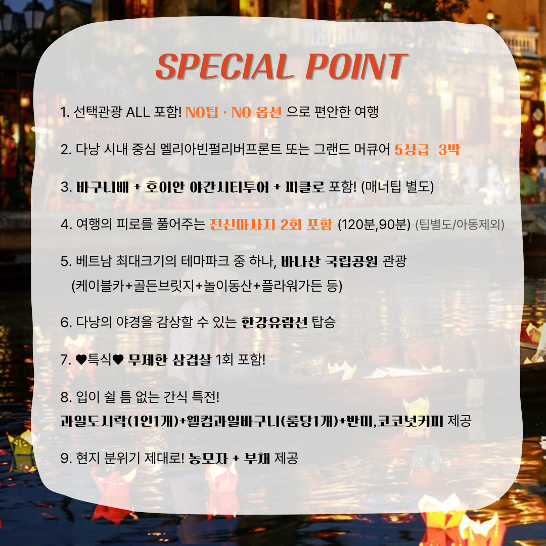 ✔️ 다낭 시내 중심 멜리아빈펄리버프론트 또는 그랜드 머큐어 5성급 3박 ✔️ 전신마사지 120분 1회 + 90분 1회 총 2회! ✔️ 입이 쉴 틈 없는 간식 특전 ✔️ 미식+휴식 빠짐없는 고퀄리티 여행
