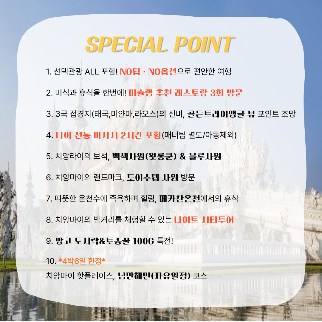 어느 것 하나 놓칠 수 없는 치앙마이 골든트라이앵글 미슐랭투어 ! 🩷CHECK POINT🩷 ✔ 매일매일 미슐랭 추천 레스토랑 방문으로 맛있는 여행🥣 ✔노노특전🔥전신마사지 2시간+나이트시티투어+정글투어 ✔노노특전🔥망고도시락 & 치앙마이 토종꿀 제공 ✔미얀마/라오스/태국 접경 지역 골든트라이앵글 조망 포함! ✔백색사원/청색사원/도이수텝 등 필수 관광 코스 포함!!