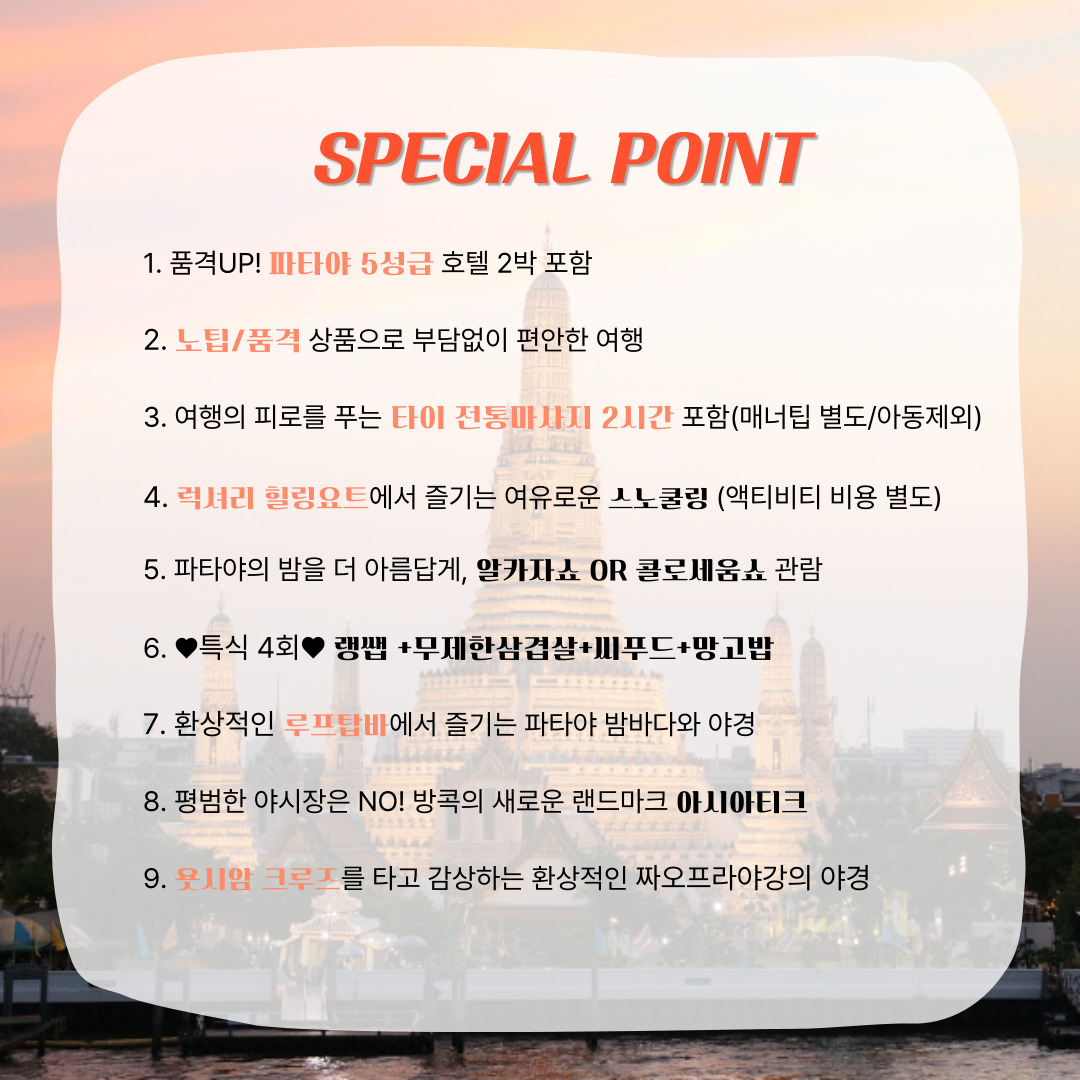 “노팁, 풀옵션으로 즐기는 알찬구성 핵심 포인트! 1️⃣ 거대한 황금빛 와불상이 있는 왓포사원 🛕 2️⃣ 다채로운 방콕을 만끽할 수 있는 수상시장과 가옥 🚣‍♀️ 3️⃣ 전통 마사지 2시간 💆‍♀️ 4️⃣ 파타야의 밤을 장식할 알카자쇼 또는 콜로세움쇼 관람 🎭✨ 5️⃣ 럭셔리 힐링요트 탑승 🚤💎 6️⃣ 황금절벽사원과 코끼리 트레킹 체험 🐘⛰️ 7️⃣ 시암 엣 시암 OR 버진 루프탑에서 칵테일, 맥주, 음료 한잔 🍸🍻 8️⃣ 욧시암 크루즈에서 짜오프라야강의 멋진 야경 🌆🚢