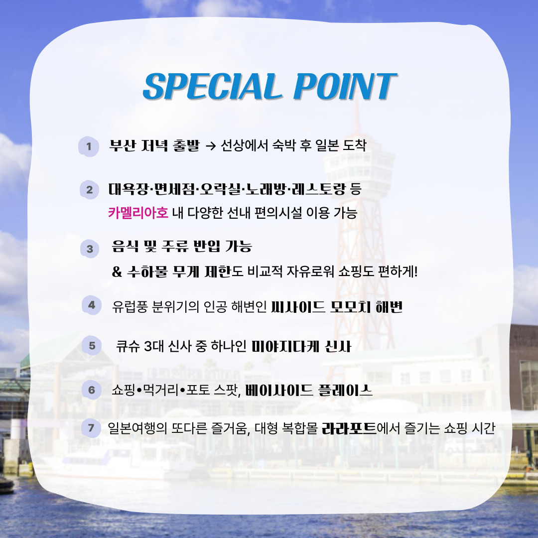 🧳 관광지 CHECK POINT 🧳 🌊 유럽풍 분위기의 인공 해변인 씨사이드 모모치 해변 🏙️ 234m와 8,000장의 유리로 단장한 후쿠오카 타워 ⛩️ 큐슈 3대 신사 중 하나인 미야지다케 신사 🌸 후쿠오카 성터가 남아있는 꽃놀이 명소 마이즈루 공원 📚 학문의 신을 모신 태재부 천만궁 🛍️ 종합 쇼핑몰 라라포트 자유 쇼핑 📸 쇼핑•먹거리•포토 스팟, 베이사이드 플레이스 🚢 카멜리아 CHECK POINT 🚢 ✨ 부산 출발, 저녁 출발 → 선상에서 숙박 후 일본 도착 🎮 오락실, 노래방, 레스토랑 등 다양한 즐길거리 🍣 자유로운 식사 및 주류 반입 가능 🛍️ 수하물 무게 제한도 비교적 자유로워 쇼핑도 편하게! 🛳️ 출발일 | 18:00 부산국제여객터미널 집결 🛳️ 도착일 | 18:30 부산국제여객터미널 도착 ※ 선실 업그레이드는 요청 조건 입니다 ※