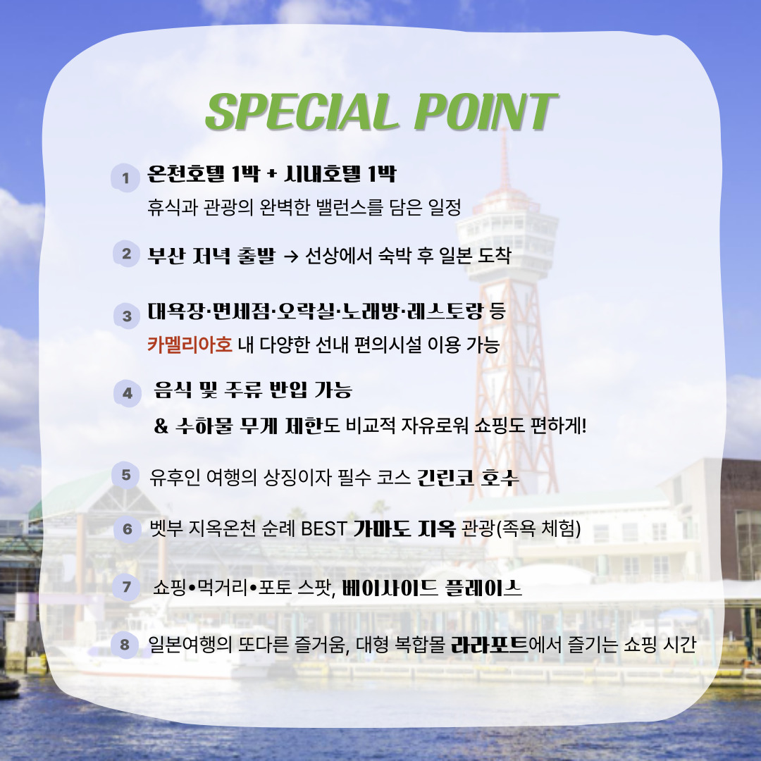 🧳 관광지 CHECK POINT 🧳 🌫️ 유후인 여행의 상징이자 필수 코스 긴린코 호수 🧸 아기자기한 상점들이 즐비하여 동화마을 같은 민예거리 ♨️ 신비한 지옥 온천 가마도 지옥 ⛩️ 약 3천 개의 개구리 석상이 있는 뇨이린지 신사 #일본 📚 학문의 신을 모신 태재부 천만궁 🏞️ 후쿠오카 시민들의 휴식처 오호리 공원 🛍️ 종합 쇼핑몰 라라포트 자유 관광 📸 쇼핑•먹거리•포토 스팟, 베이사이드 플레이스 🚢 카멜리아 CHECK POINT 🚢 ✨ 부산 출발, 저녁 출발 → 선상에서 숙박 후 일본 도착 🎮 오락실, 노래방, 레스토랑 등 다양한 즐길거리 🍣 자유로운 식사 및 주류 반입 가능 🛍️ 수하물 무게 제한도 비교적 자유로워 쇼핑도 편하게!