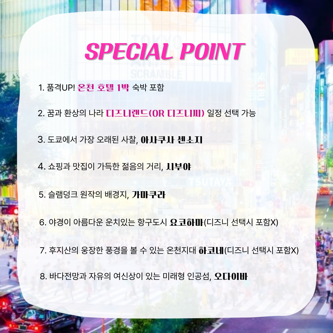 ✨핵심 포인트 🎁도쿄에서 가장 오래된 사찰 아사쿠사 🎁젊음의 거리, 쇼핑과 먹거리의 천국 시부야 🎁'슬램덩크' 의 원작 배경지 가마쿠라 🎁야경이 아름다운 운치 있는 항구 도시 요코하마 🎁꿈과 환상의 나라 디즈니랜드 🎁후지산의 웅장한 풍경을 볼 수 있는 온천 지대 하코네 🎁자유의 여신상이 있는 오다이바