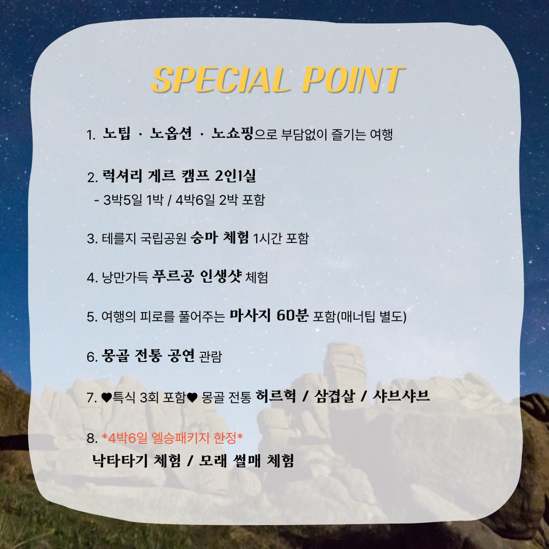 - 몽골은 의료시설이 열악하고 여름철 성수기 항공편 좌석 확보가 어려우므로 안전사고를 당할 경우 큰 위험에 처할 수 있으니 항상 안전에 신경써 주실 것을 당부 드림