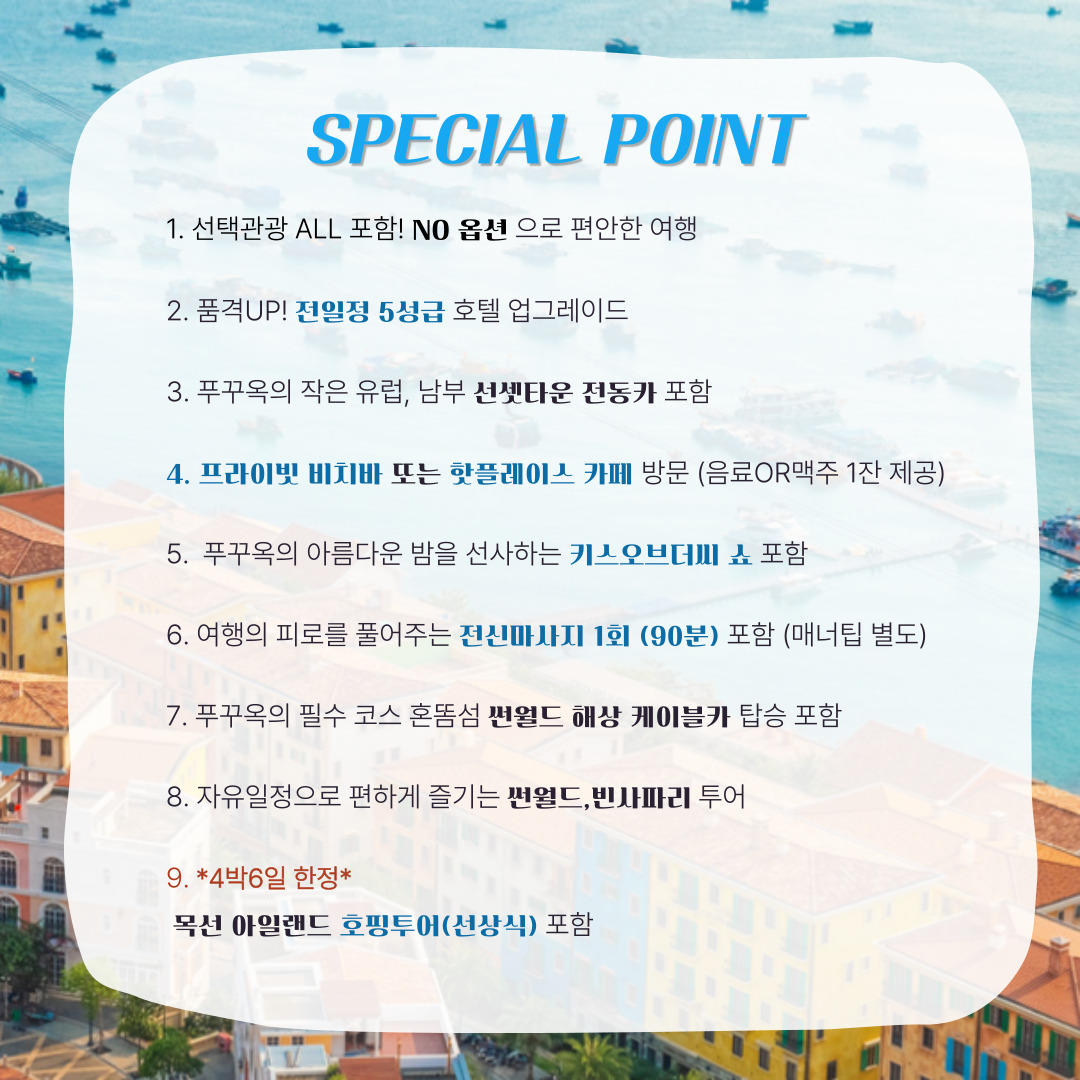 푸꾸옥이 HOT한 이유!🔥🔥 - 휴양과 관광을 동시에 즐길 수 있는 최적의 여행지 - 때 묻지 않은 순수함과 아름다움이 존재하는 곳 - 4계절 내내 온순하고 건조한 날씨로 불쾌지수 0% - 에메랄드 빛 맑은 바다가 기다리는 곳 🌊NO옵션 패키지 CHECK POINT🌊 🌴완전정복 패키지 답게 푸꾸옥 남부부터 북부까지 알찬 일정 👉 혼똠섬 케이블카 / 썬월드 / 빈사파리 / 호국사/ 사오비치 /그랜드월드 🌴여행의 피로를 싹~ 풀어주는 전신마사지 90분 포함 🌴프라이빗 비치바 or 핫플레이스 카페 방문 🌴4박6일 일정은 푸꾸옥의 에메랄드 빛 바다에서 즐기는 호핑투어🥽🏊‍♂️까지 포함!
