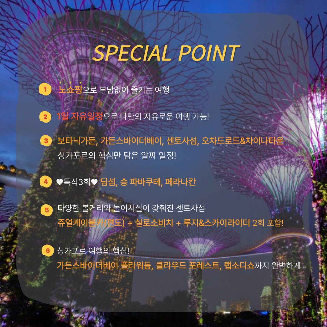 • ▶싱글룸사용료(33만원/전일정) ▶써차지안내(※ 써챠지 기간은 예약과 동시 취소 불가) 4/21~24 오키드, M소셜 호텔 7.5만원/박당 룸당 5/20~22 오키드 호텔 7.5만원/박당 룸당 10/8~11 오키드 호텔 15만원/박당 룸당 ♠싱가포르 추천 선택옵션 ♠ 옵션1. 스카이파크+오픈탑버스+리버보트 - US$140/인 옵션2. 스카이파크+오픈탑버스+리버보트+윙스오브 또는 발마사지 - US$180/인 옵션3. 스카이파크+오픈탑버스+리버보트+윙스오브 또는 발마사지+플라이어 - US$240/인 옵션4. 스카이파크+오픈탑버스+리버보트+발마사지+윙스오브타임+플라이어 - US$280/인 *연합상품이므로 현지사정에 따라 옵션내용 및 요금은 변동 될 수 있습니다 *3/4~4/12 플라이어 옵션 점검으로 옵션 중단