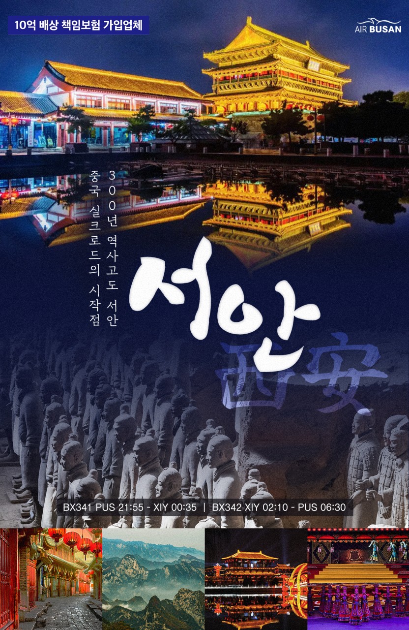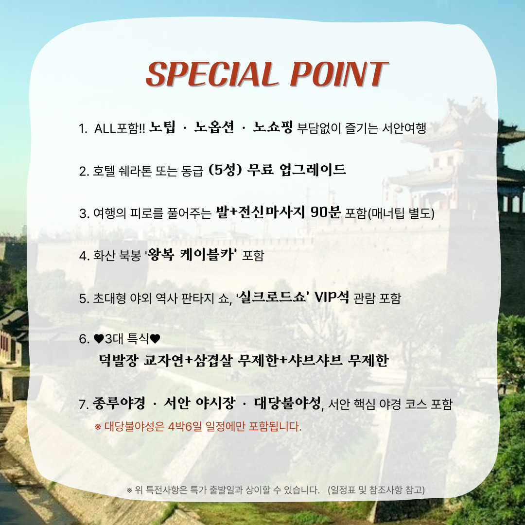 서안(西安, Xi’an) 부산에서 서안으로 갈 수 있는 단 하나의 길 에어부산✈ 아테네, 카이로, 로마와 함께 고대 문명의 4대 도시로 꼽히는 도시 중국 오악 중 서악이라 불라는 화산이 근교에 자리잡고 있으며 중국의 신비한 병마용과 아름다운 화청지를 볼 수 있는 중국의 5000년 역사가 담긴 도시 중국 중심에 자리하고 있어 여러지역으로 이동이 용이해 또 다른 중국의 매력적인 관광지를 볼 수 있는 교통중심지 서안 중국을 알려면 서안으로 떠나라 ALL포함 노팁, 노옵션, 노쇼핑 화산.품격상품 ✔호텔 쉐라톤 또는 동급 (5성) 무료 업그레이드 ✔발+전신 마사지 90분 포함 ✔화산 북봉 왕복 케이블카 포함 ✔덕발장 교자연+삼겹살 무제한+샤브샤브 무제한 3대 특식 📛 다시 만날 서안 📛 🎊 2026년 4월 1일부터 에어부산 부산-서안 재운항(화수/금토 주 4회) ✈ BX341 PUSXIY 2205 0035+1 ✈ BX342 XIYPUS 0210 0630 화/수출발 3박 5일 금/토출발 4박 6일