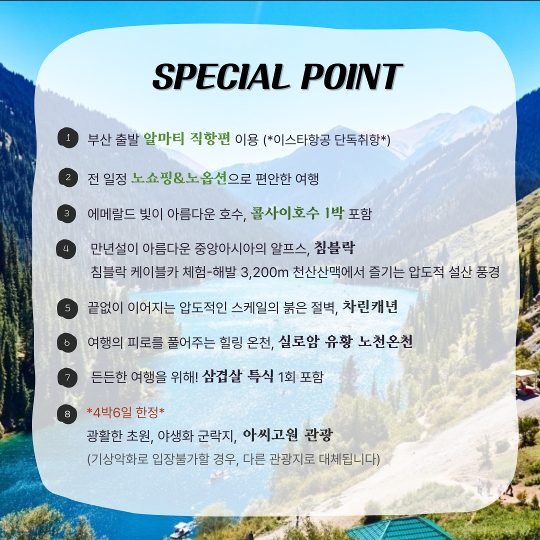 한국에서 7시간이면 도착할 수 있는 가까운 거리에서 유럽의 감성과 경이로운 대자연을 동시에 즐길 수 있습니다. 압도적인 차른 캐년, 에메랄드 빛 아름다운 콜사이 호수, ‘중앙아시아의 스위스’ 침블락 케이블카까지 한 번에 경험하고, 마지막에는 노천 유황온천에서 여유로운 힐링을 만끽할 수 있습니다. ✔️ 부산 ↔ 알마티 직항 노선 ✔️ 노쇼핑 / 노옵션 ✔️ ✔️ 침블락 설산 + 3단 케이블카 🚡 ✔️ 카인디 · 콜사이 · 차른 캐년 대자연 핵심 코스 ✔️ 실로암 유황온천 체험 ♨️ ✔️ 알마티 시내 + 예술의 거리 감성 산책 🎨