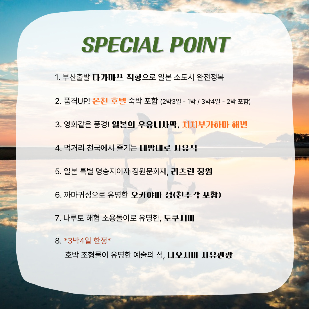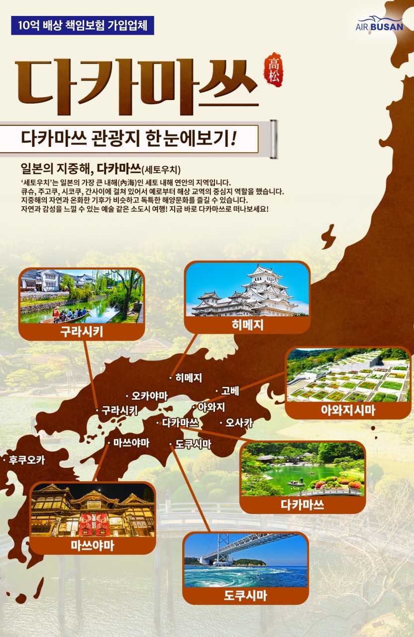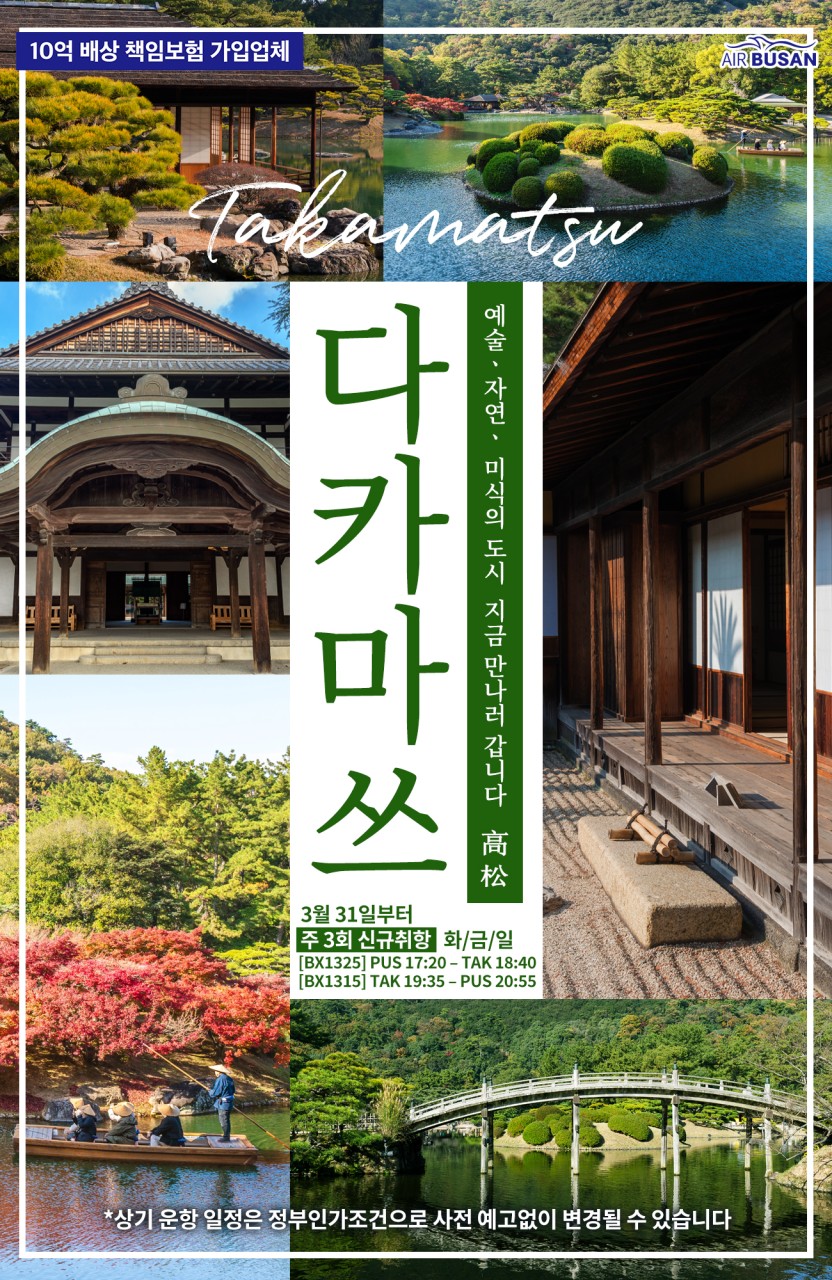 🔎다카마쓰 힐링♥온천팩 포인트 ♨️하루의 피로를 녹이며 소소한 행복을 느끼는 온천욕 🍱내맘대로 자유식 🎞️영화같은 풍경! 일본의 우유니! 치치부가하마 해변 🎃예술의 섬! 나오시마 자유관광 (그 유명한 호박!) 🌳일본의 특별 명승지! 국보급 리츠린 정원 🙏소원을 빌어봐! 고토히라 궁 🌊나루토 해협 소용돌이로 유명한 도쿠시마 2026년 3월 31일 ~ 10월 24일 ✈️ 화-3박4일 // 금·일-2박3일 (주 3회 운항) 🛫BX1325 PUS 17:20 - TAK 18:40 🛬BX1315 TAK 19:35 - PUS 20:55