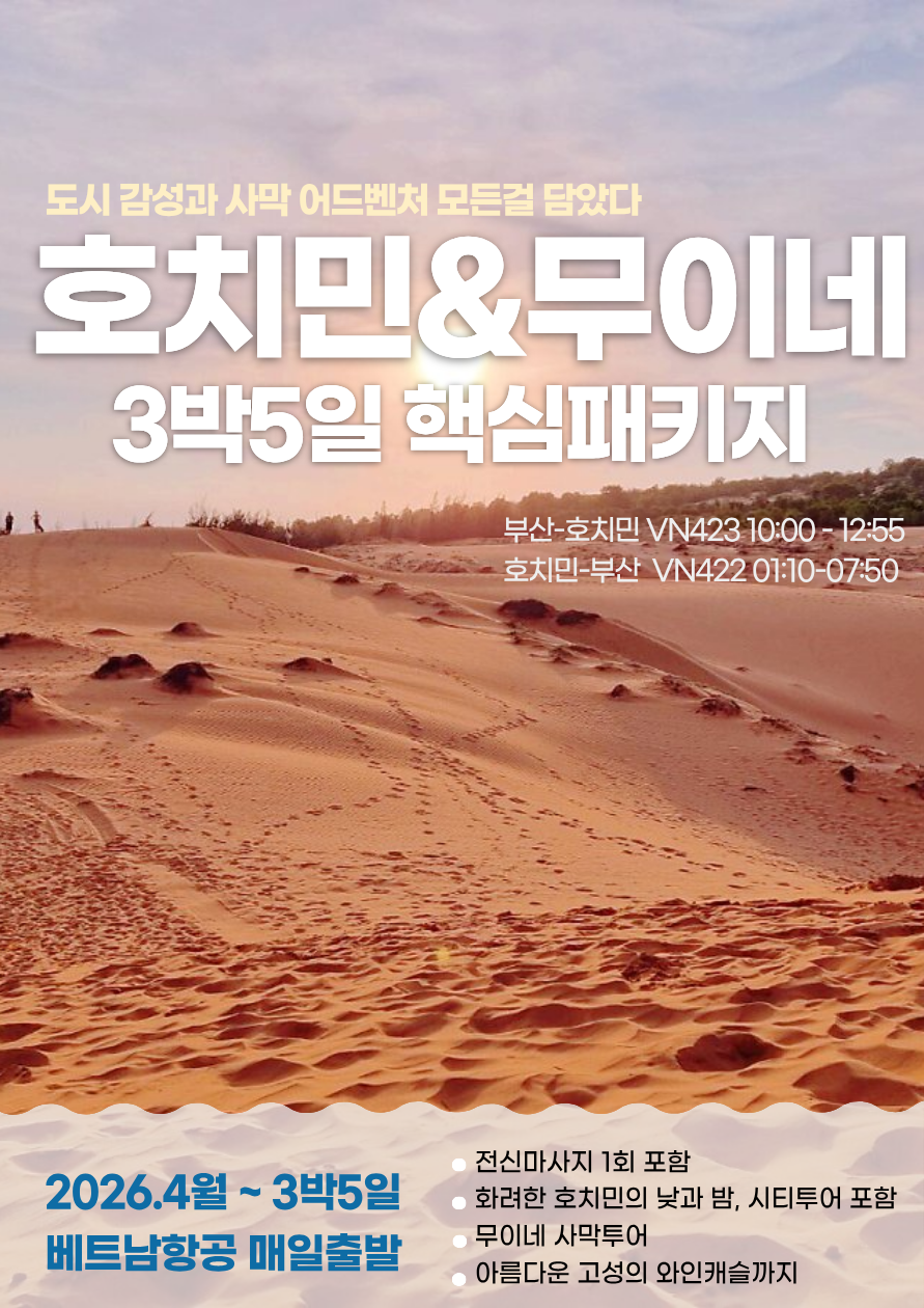 ㅇ 무이네(판티엣) 지역 사막 투어(화이트/레드 샌듄)는 강한 자외선과 고온 환경이 특징이므로 탈수 및 열사병 예방에 유의해야 합니다.