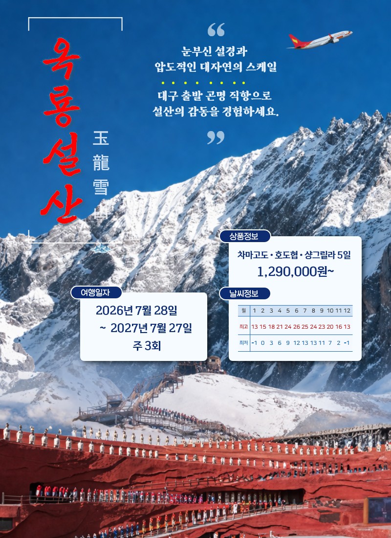 운남의 대자연을 완성하다 ✨ 설산 · 협곡 · 고성 · 티베트 문화까지 한 번에 만나는 운남 핵심 루트 1. 수억 년 세월이 만든 기암괴석의 숲과 신비로운 동굴 탐험 2. 유네스코 고성에서 만나는 나시족 전통 문화와 운하 골목 산책 3. 해발 4,506m 설산 전망과 에메랄드빛 계곡 절경 4. 차마고도 옛길을 따라 걷는 협곡 트레킹과 티베트 고원 풍경 자연 · 역사 · 문화 · 트레킹을 모두 담은 진짜 운남 여행! 🌿 노팁 · 노옵션 패키지 CHECK POINT 🌿 👉 유네스코 자연유산 석림 & 카르스트 지형의 천연동굴 옥주동 포함 👉 옥룡설산 빙천 케이블카 & 람월곡·백수하 관광 👉 차마고도 호도협 미니 트레킹 + 상호도협전망대 왕복 에스컬레이터 포함 👉 티베트 문화의 중심 샹그릴라 핵심 관광 👉 여강고성 자유 산책 & 인상여강 가무쇼 포함(타사 옵션) 👉 여행 피로를 풀어주는 전신 마사지 90분 포함(팁별도) 🛫 이 상품만의 특별함! ✔ 대구 출발 직항 전세기 이용으로 편안한 이동 ✔ 자연·고성·설산·티베트 문화를 한 번에 담는 완성형 루트 ✔ 타사 옵션 관광과 체험이 모두 포함된 프리미엄 구성 ✔ 이동 동선이 가장 좋은 황금 코스 설산과 협곡, 고성과 티베트 문화, 그리고 힐링까지 모두 경험하는 운남 완성형 프리미엄 패키지입니다.